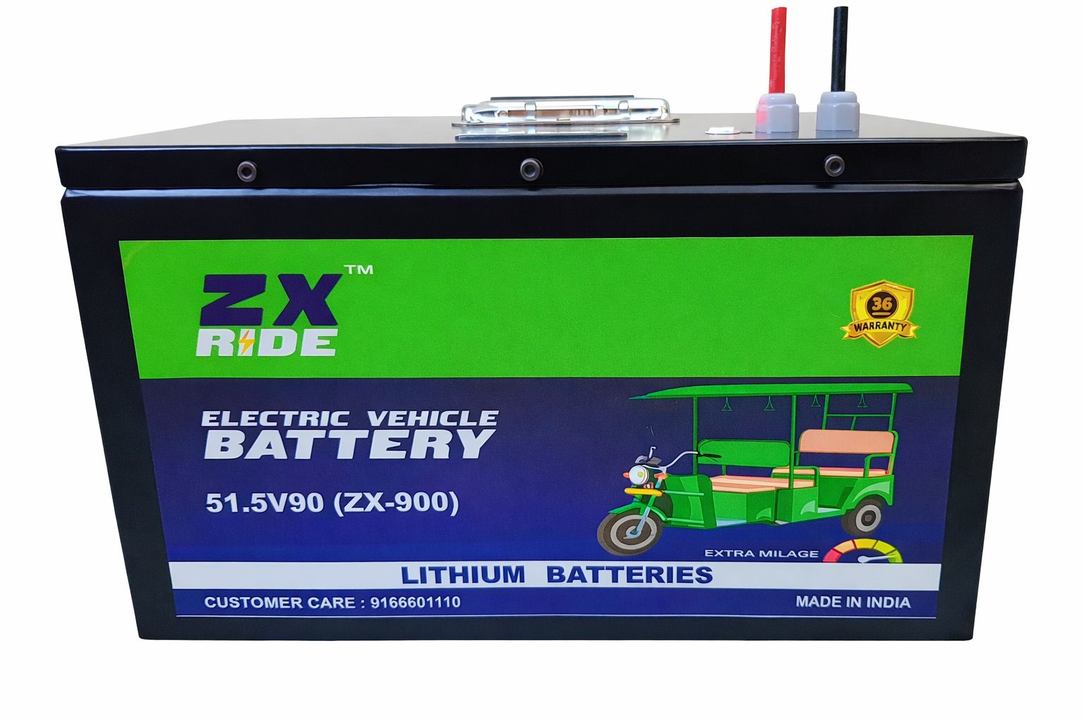 The ZX Ride ZX-900 is a premium 51.5V 90Ah lithium battery engineered for superior electric vehicle performance. Designed especially for e-rickshaws and heavy-duty EV applications, it provides higher energy efficiency, longer backup time, and faster charging compared to traditional batteries.